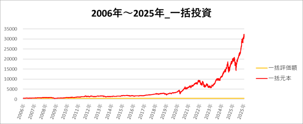 一括投資の一番リターンの高い期間は「2006年~2025年」でした。