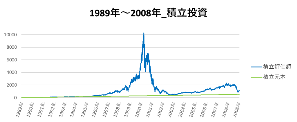 積立投資の一番リターンの低い期間は「1989年~2008年」でした。