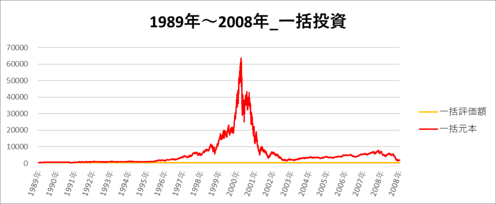 一括投資の一番リターンの低い期間は「1989年~2008年」でした。