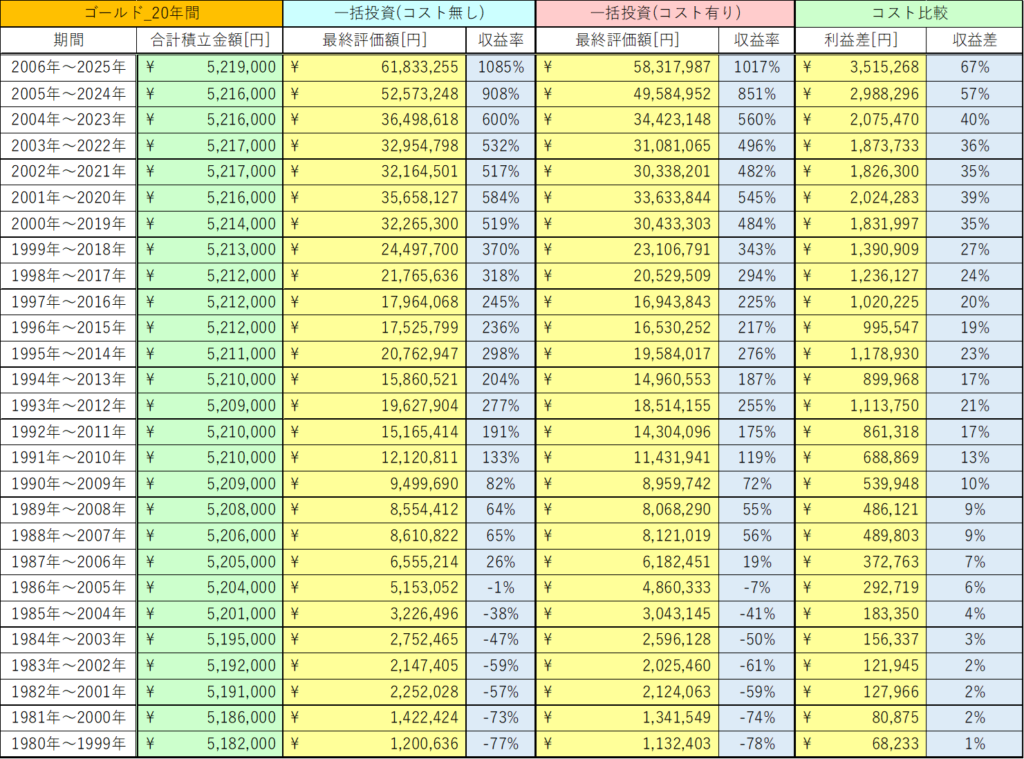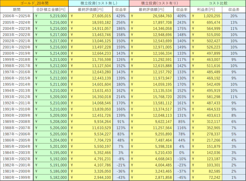 今回は、ゴールドの20年間の積立投資と一括投資におけるコストの影響を検証しました。