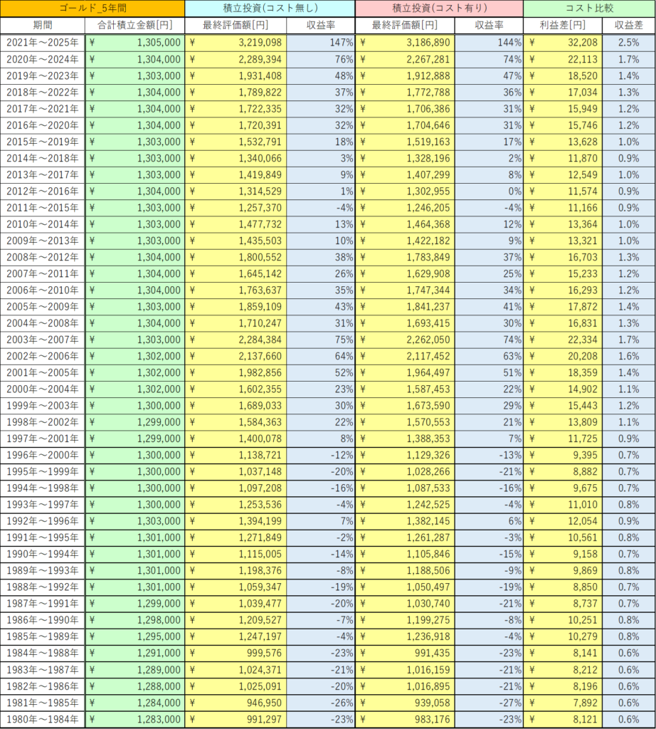 【検証】ゴールドを5年運用するとコストでいくら差が出る?0%と0.2925%を徹底比較