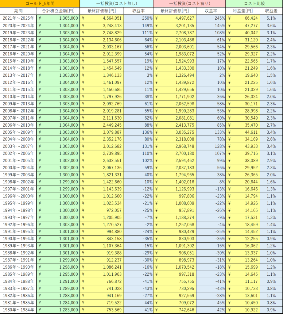 今回は、ゴールドの5年間の積立投資と一括投資におけるコストの影響を検証しました。