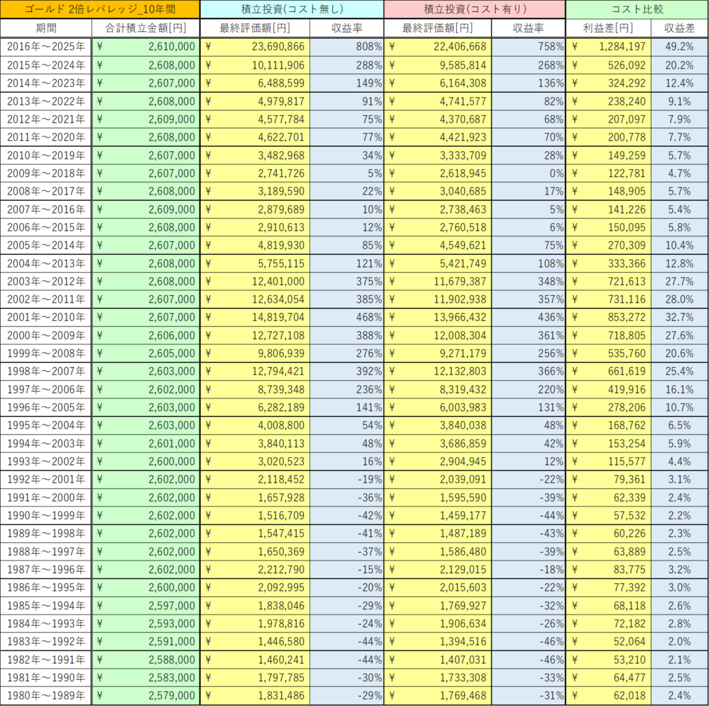 今回は、ゴールド 2倍レバレッジの10年間の積立投資と一括投資におけるコストの影響を検証しました。