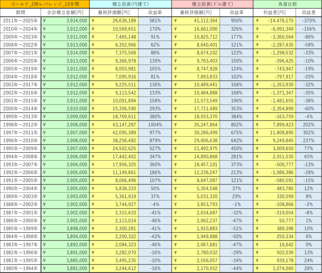 【検証】ゴールド 2倍レバレッジを15年運用すると為替でいくら変わる?円建てとドル建てを徹底比較