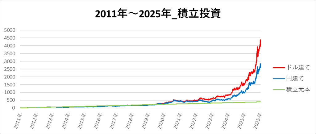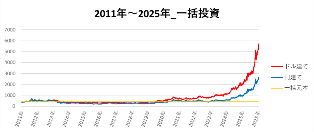 画像は「2011年~2025年」の期間におけるドル建てと円建てのゴールド 2倍レバレッジのチャートになります。