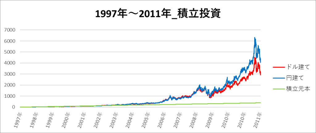 画像は「1997年~2011年」の期間におけるドル建てと円建てのゴールド 2倍レバレッジのチャートになります。
