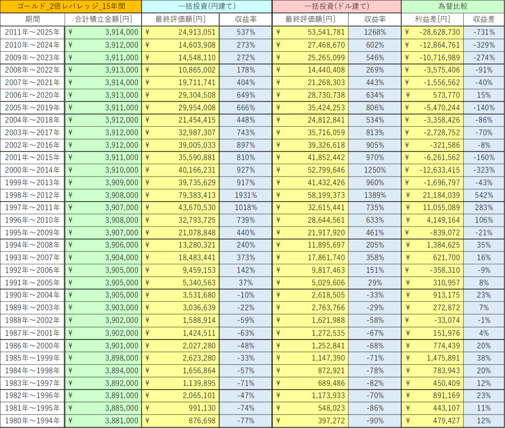 今回は、ゴールドの2倍レバレッジの15年間の積立投資と一括投資における為替の影響を検証しました。