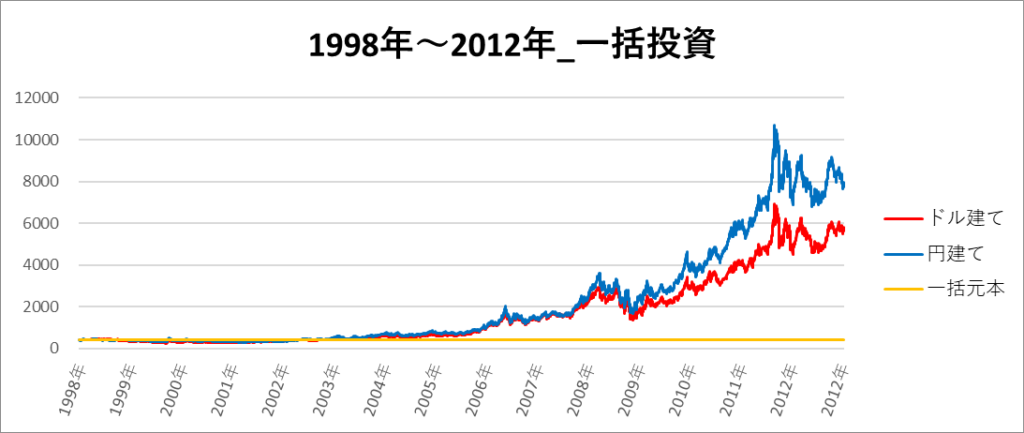 画像は「1998年~2012年」の期間におけるドル建てと円建てのゴールド 2倍レバレッジのチャートになります。