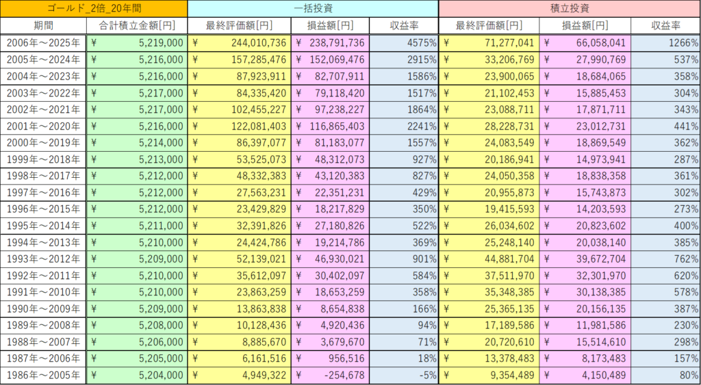 これらのデータから総じてゴールド2倍レバレッジの20年間の積立投資は