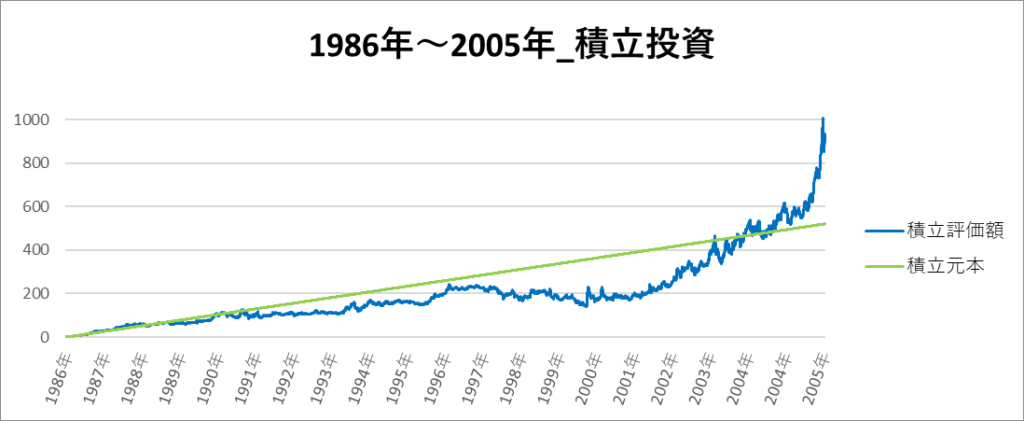 積立投資の一番リターンの低い期間は「1986年~2005年」でした。