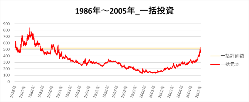 一括投資の一番リターンの低い期間は「1986年~2005年」でした。