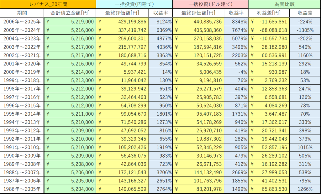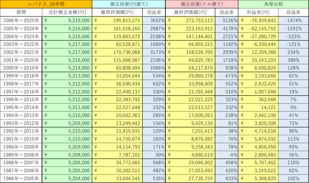 今回は、レバナスの20年間の積立投資と一括投資における為替の影響を検証しました。