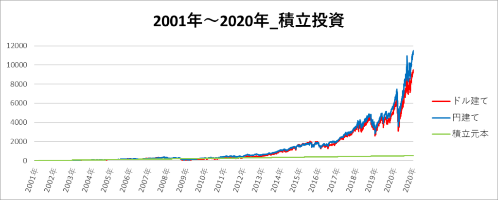 このチャートは、2003年ごろから円建てとドル建てのリターンの差が開き、最終的に円建ての方が約6,600万円も利益が多くなっています。