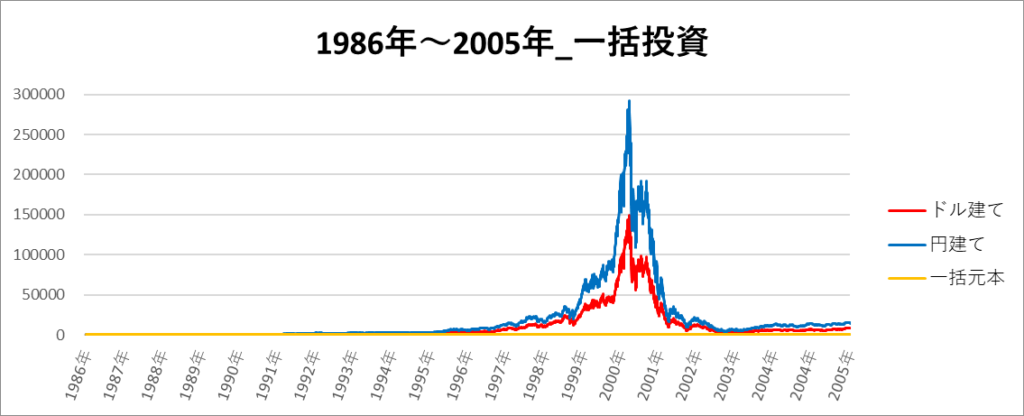 画像は「1986年~2005年」の期間におけるドル建てと円建てのレバナスのチャートになります。