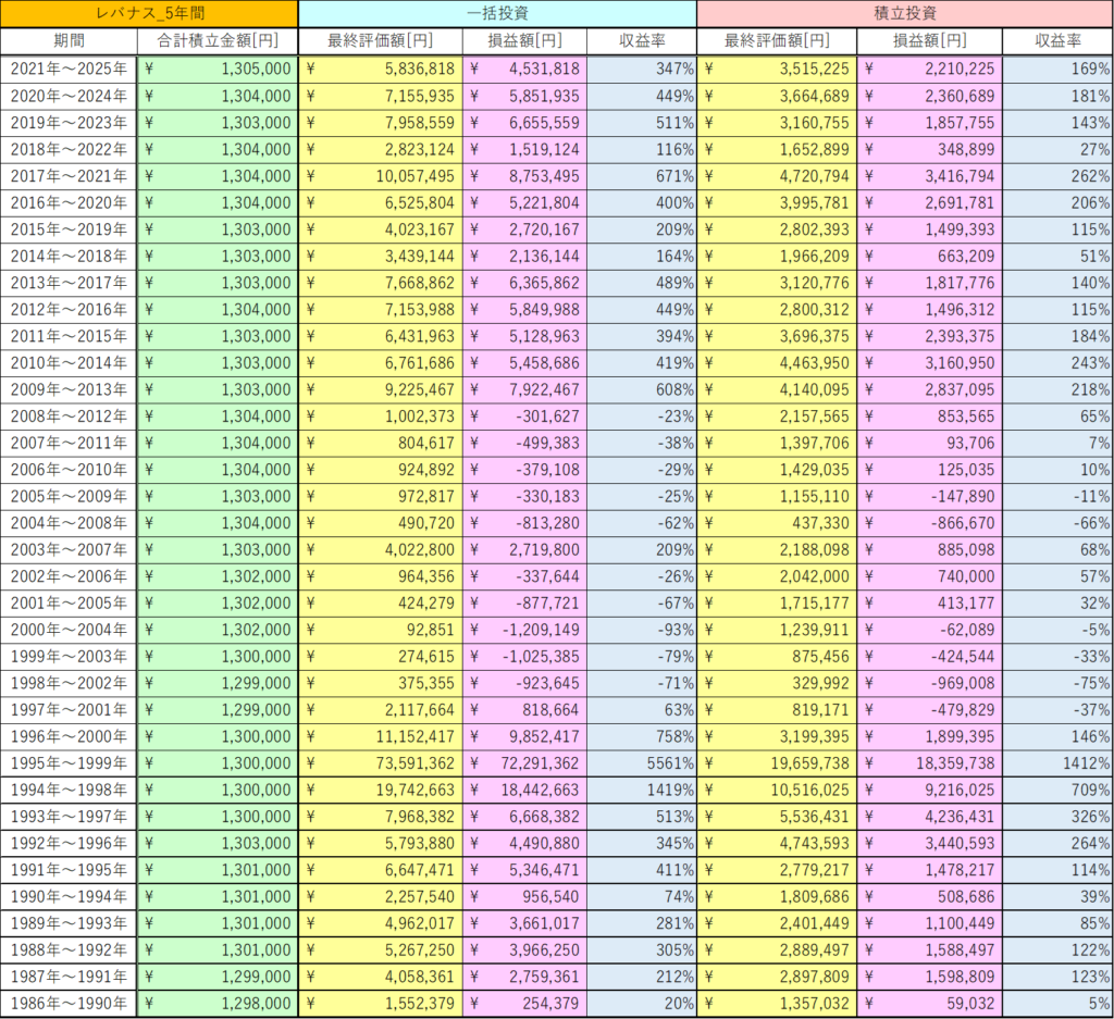 積立投資は、1986年から2025年の期間においてリターンがマイナスになった期間は6回ありました。