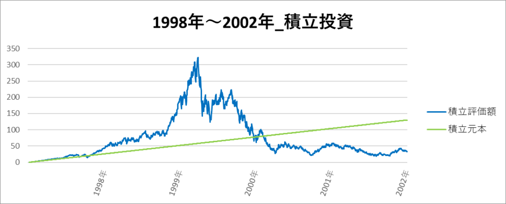 積立投資の一番リターンの低い期間は「1998年~2002年」でした。