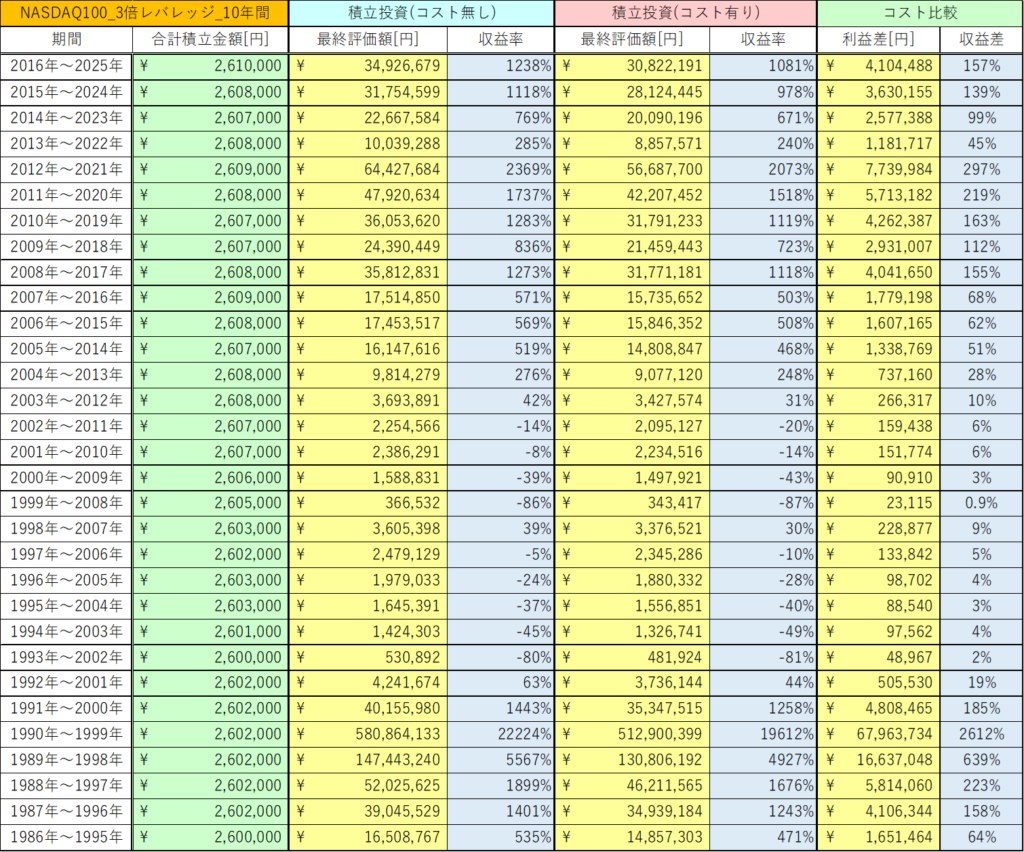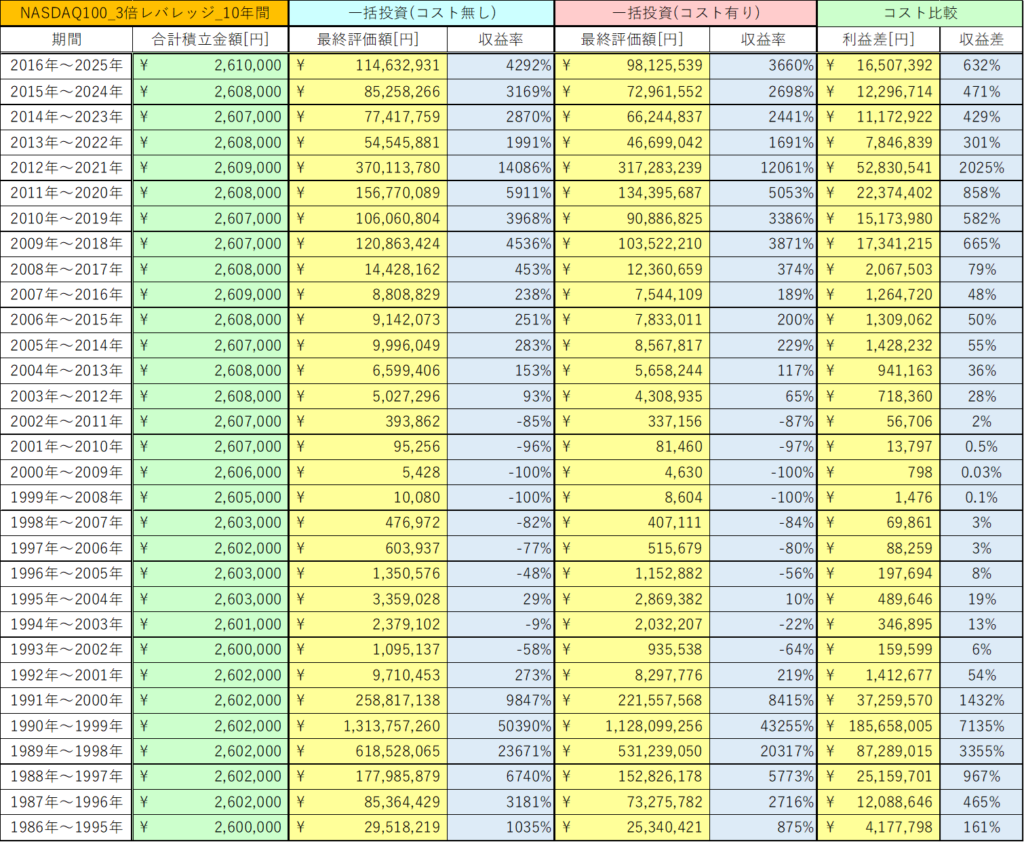 今回は、NASDAQ100 3倍レバレッジの10年間の積立投資と一括投資におけるコストの影響を検証しました。