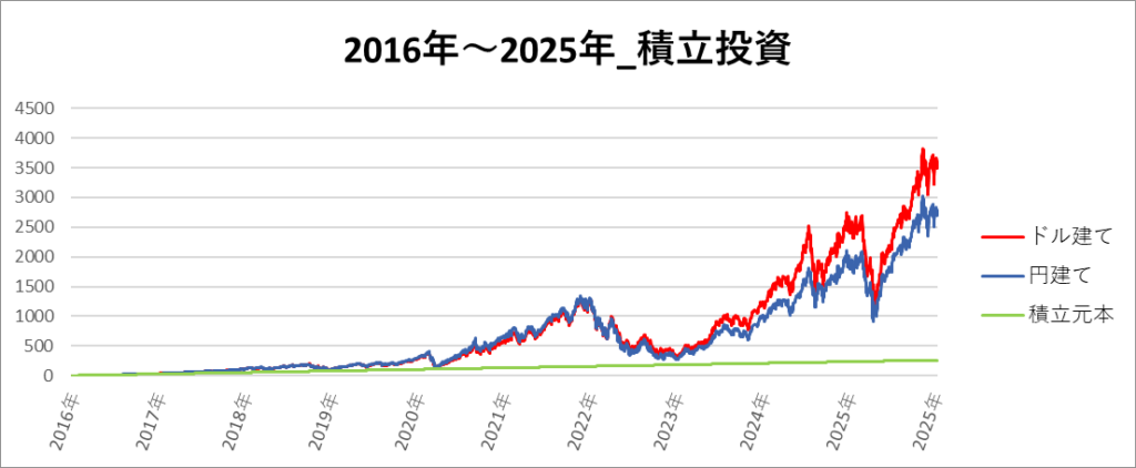 画像は「2016年~2025年」の期間におけるドル建てと円建てのNASDAQ100 3倍レバレッジのチャートになります。
