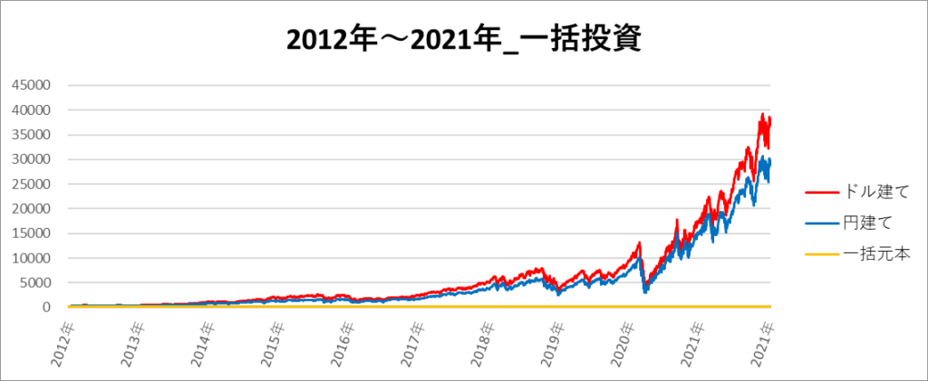このチャートは、ITバブル崩壊で円建てとドル建ては終盤で大きく下落していますが、最終的に円建ての方が約6.4億円も利益が多くなっています。