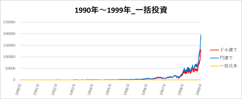 画像は「1990年~1999年」の期間におけるドル建てと円建てのNASDAQ100 3倍レバレッジのチャートになります。