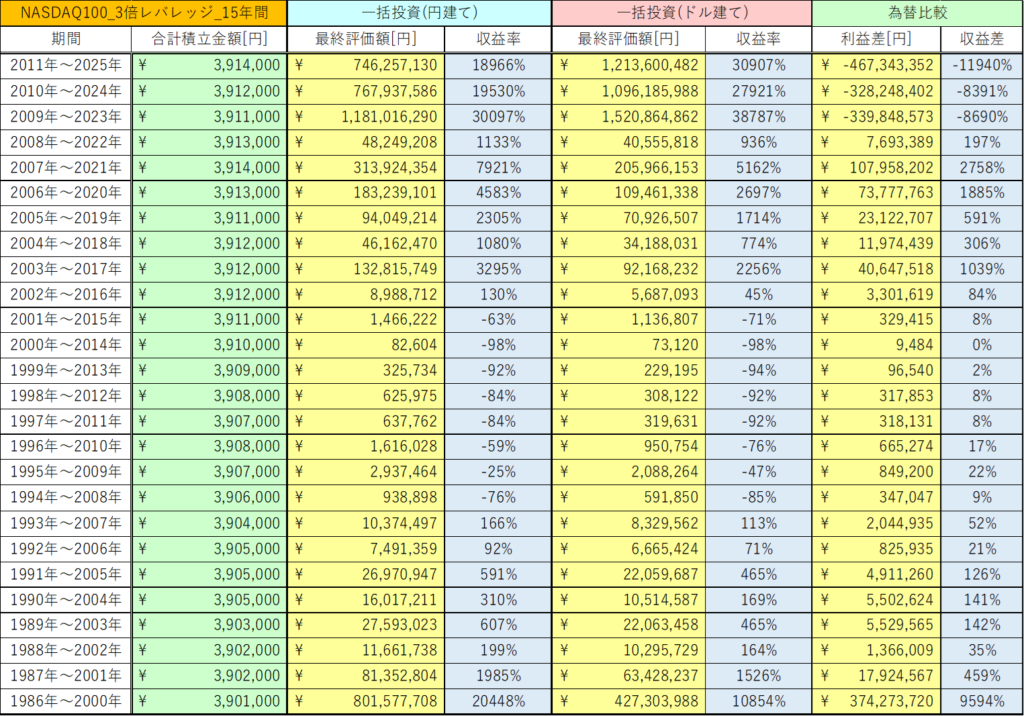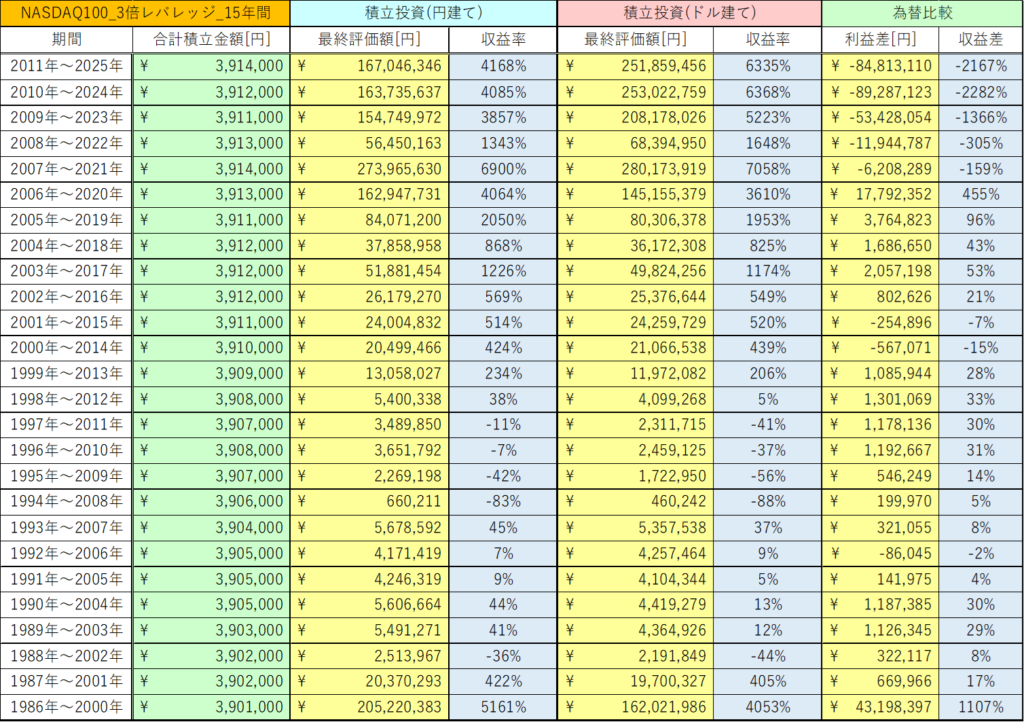 今回は、NASDAQ100 3倍レバレッジの15年間の積立投資と一括投資における為替の影響を検証しました。