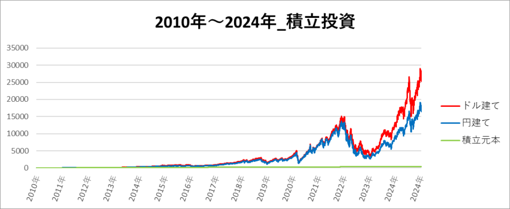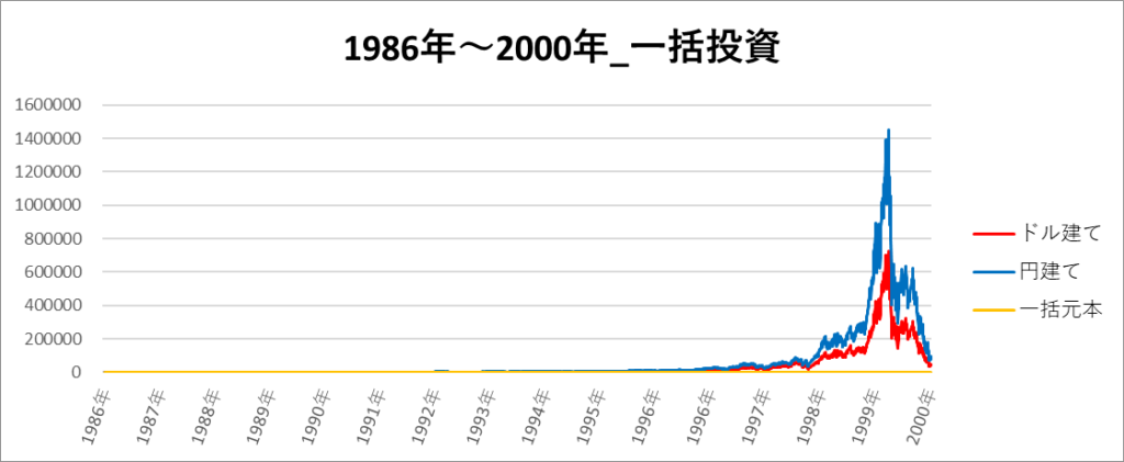このチャートは、ITバブル崩壊で円建てとドル建ては終盤で大きく下落していますが、最終的に円建ての方が約3.7億円も利益が多くなっています。