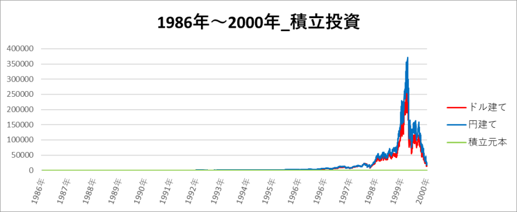 画像は「1986年~2000年」の期間におけるドル建てと円建てのNASDAQ100 3倍レバレッジのチャートになります。