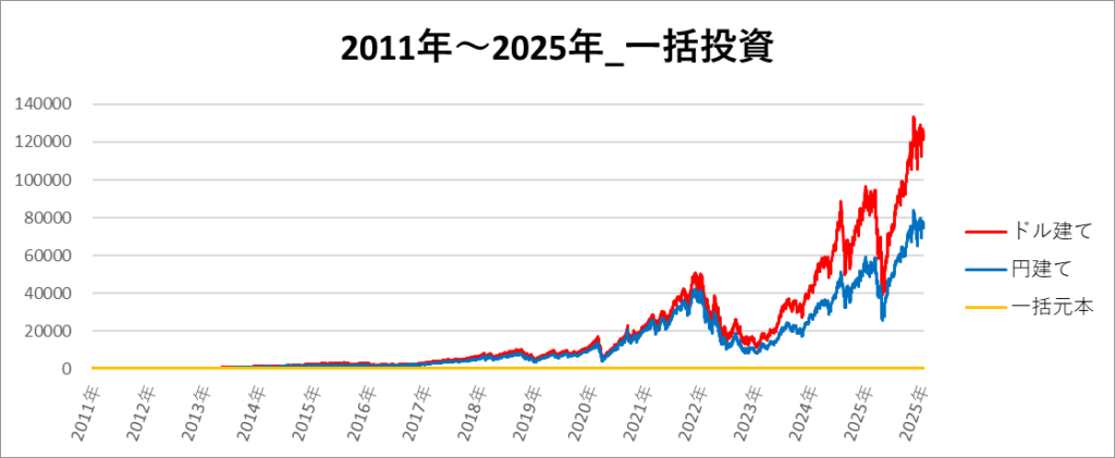 画像は「2011年~2025年」の期間におけるドル建てと円建てのNASDAQ100 3倍レバレッジのチャートになります。