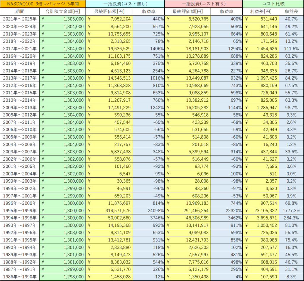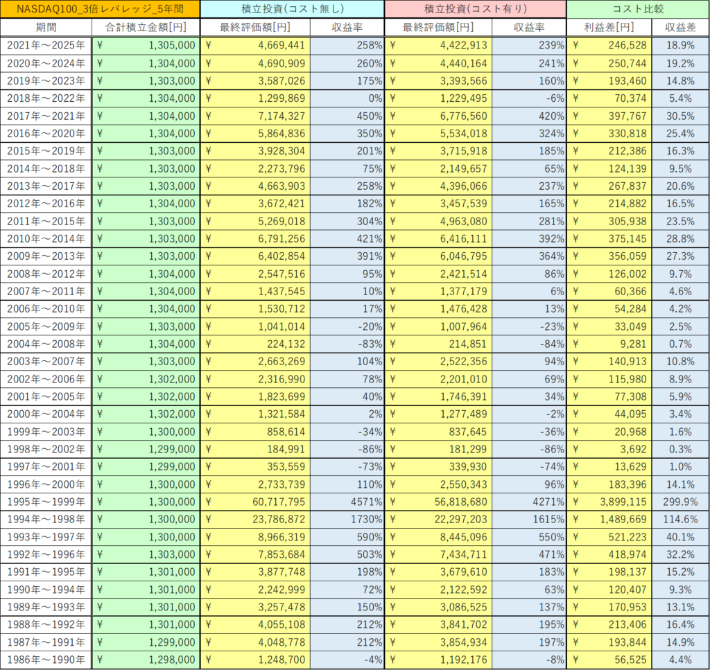 今回は、NASDAQ100 3倍レバレッジの5年間の積立投資と一括投資におけるコストの影響を検証しました。