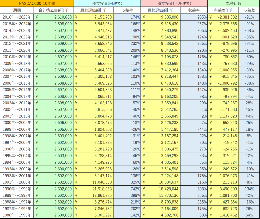 今回は、NASDAQ100の10年間の積立投資と一括投資における為替の影響を検証しました。