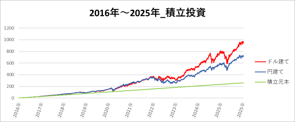 積立投資における為替リスク有無の差はこの通りになりました。