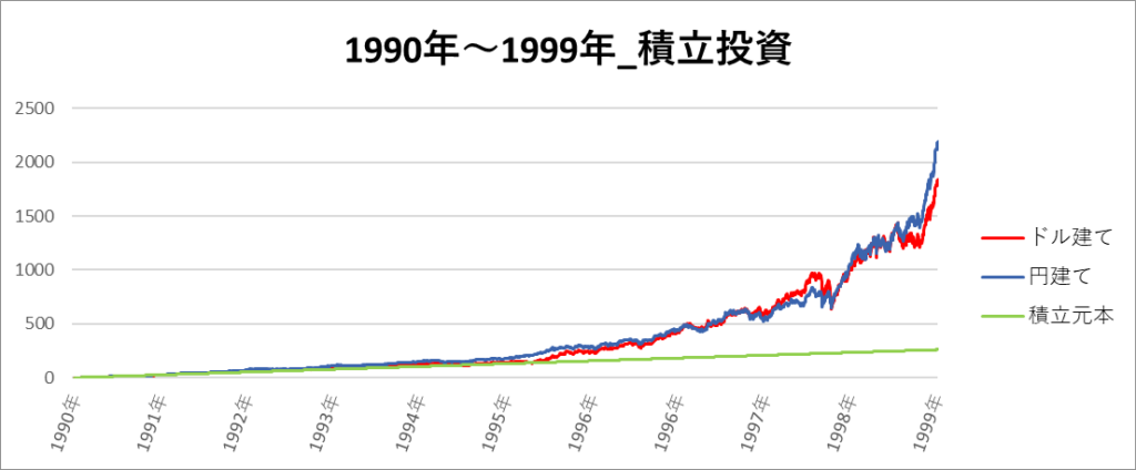 画像は「1990年~1999年」の期間におけるドル建てと円建てのNASDAQ100のチャートになります。