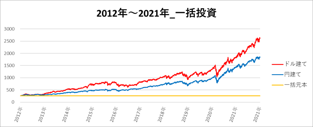 この期間は、2013年ごろからドル建てのリターンが円建ての評価額を置き去りにして高リターンになっていることが分かります。