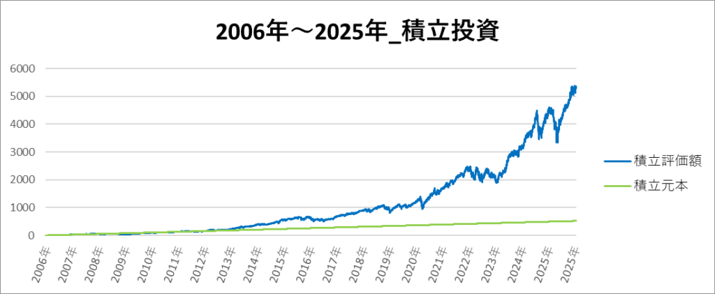 積立投資の一番リターンの高い期間は「2006年~2025年」でした。