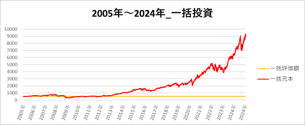 一括投資の一番リターンの高い期間は「2005年~2024年」でした。