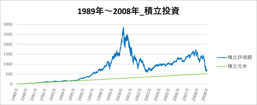積立投資の一番リターンの低い期間は「1989年~2008年」でした。
