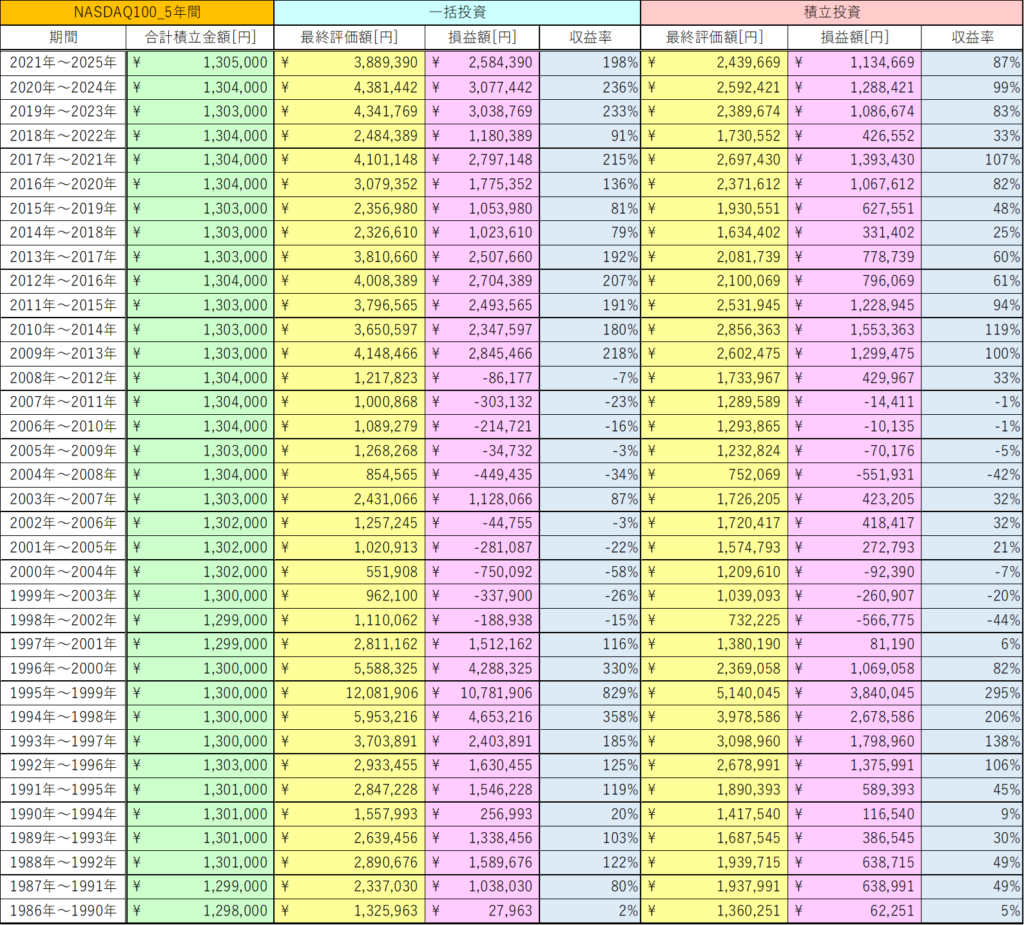 これらのデータから総じてNASDAQ100の5年間の積立投資は、マイナスになるリスクが低い投資手法ということが分かりますね。
