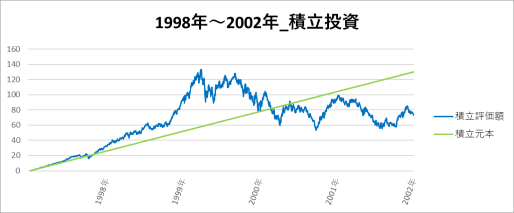 この期間は、ITバブル崩壊によって2000年ごろに大きく下落しており、最後までずっと元本割れをしています。
