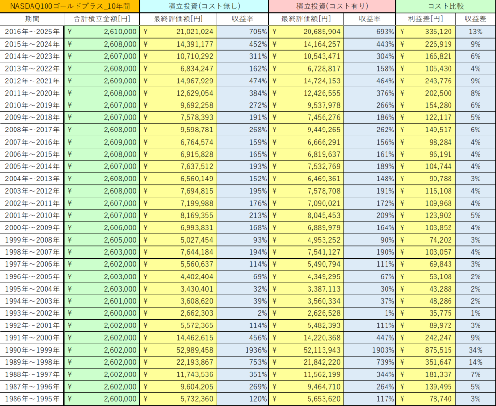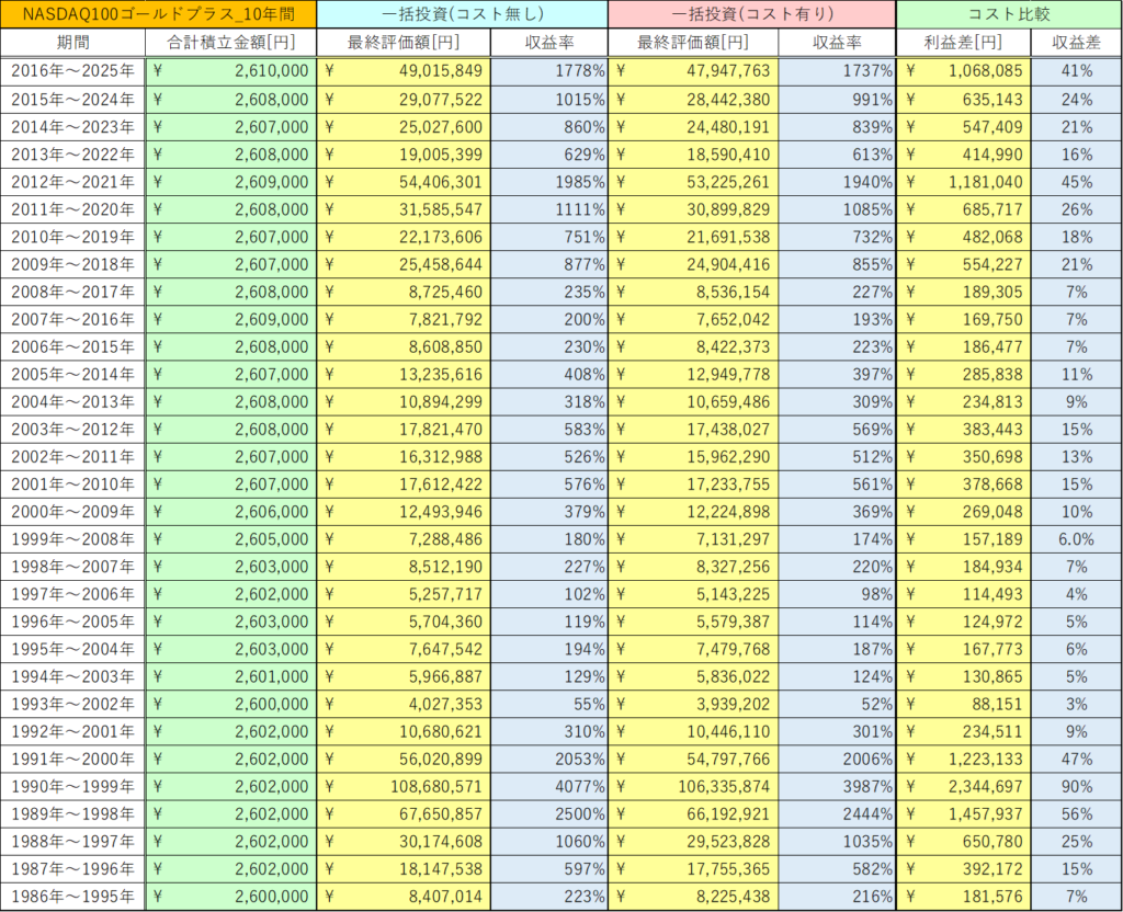 今回は、NASDAQ100ゴールドプラスの10年間の積立投資と一括投資におけるコストの影響を検証しました。