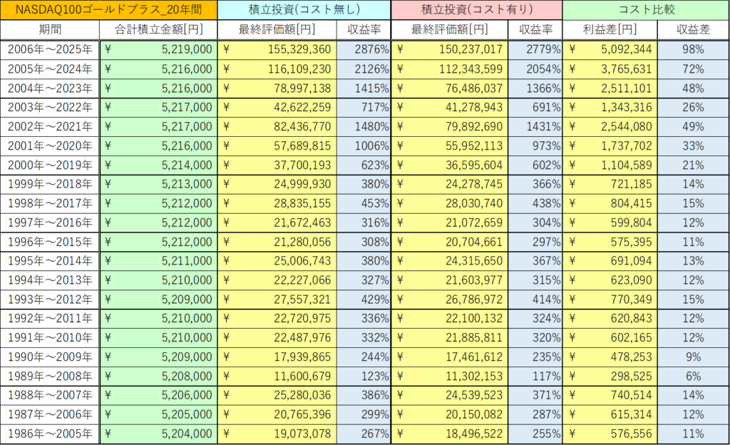 今回は、NASDAQ100ゴールドプラスの20年間の積立投資と一括投資におけるコストの影響を検証しました。