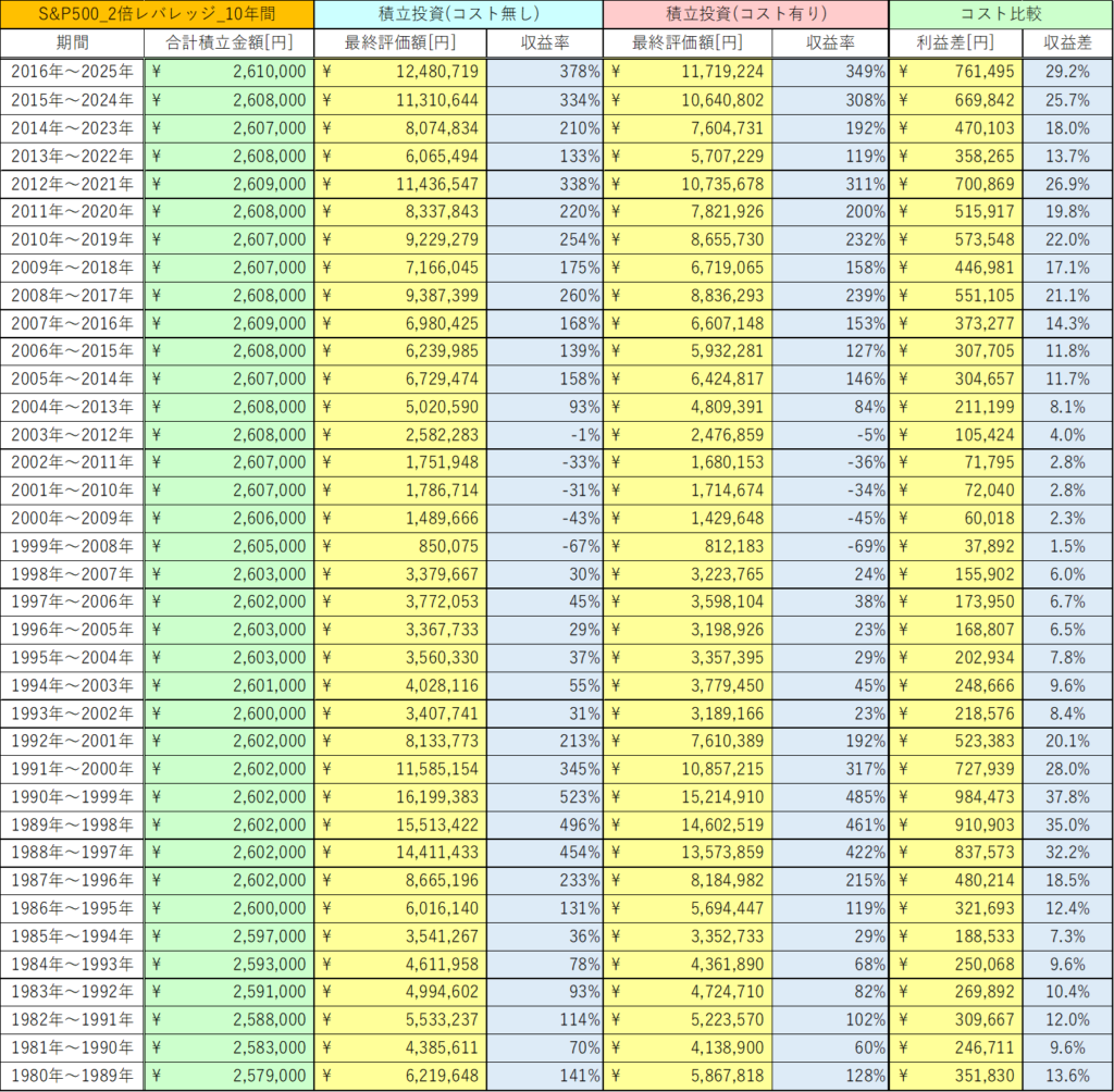 今回は、コストが利益にどれくらい影響を与えるのかを知ってもらうために2倍レバレッジを10年間の投資運用でどれだけの差が出るかを完全シミュレーションしました。