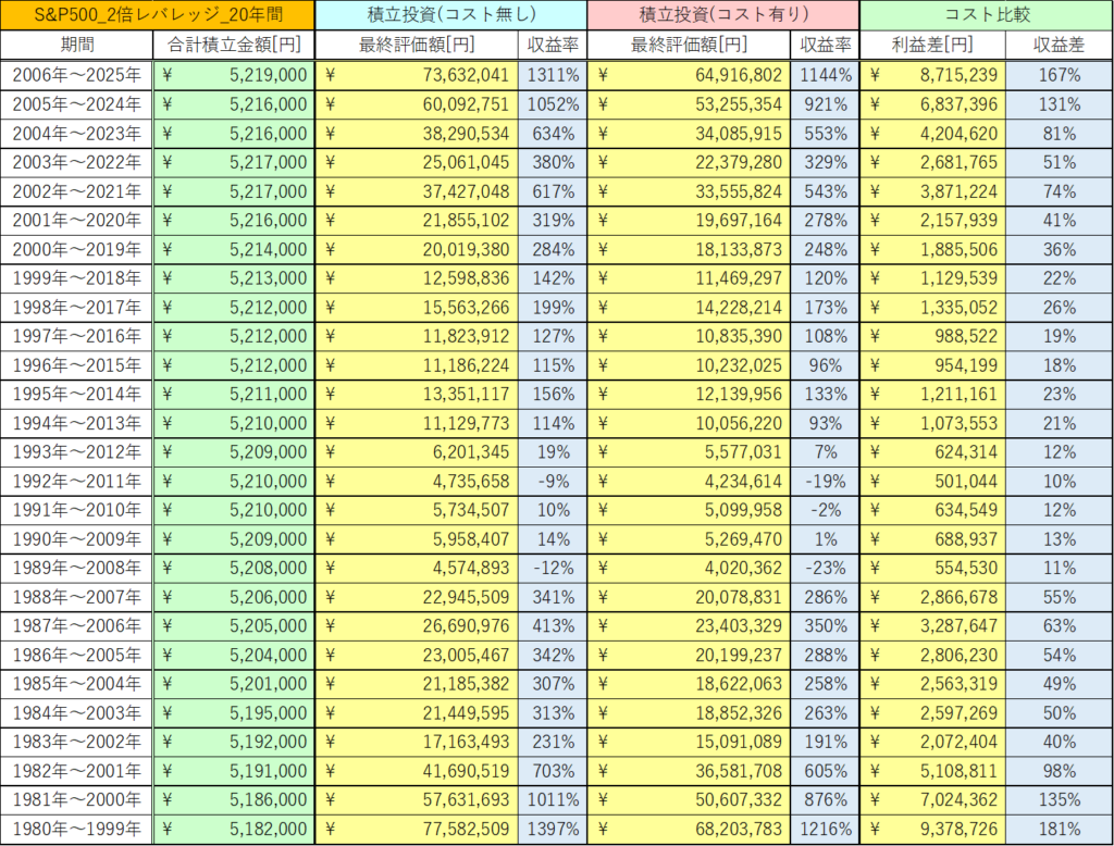 今回は、コストが利益にどれくらい影響を与えるのかを知ってもらうために2倍レバレッジを20年間の投資運用でどれだけの差が出るかを完全シミュレーションしました。