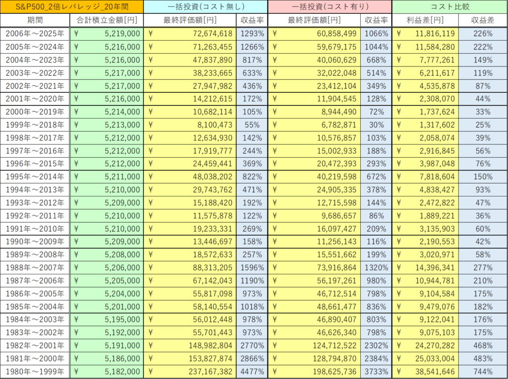 今回は、S&P500 2倍レバレッジの20年間の積立投資と一括投資におけるコストの影響を検証しました。