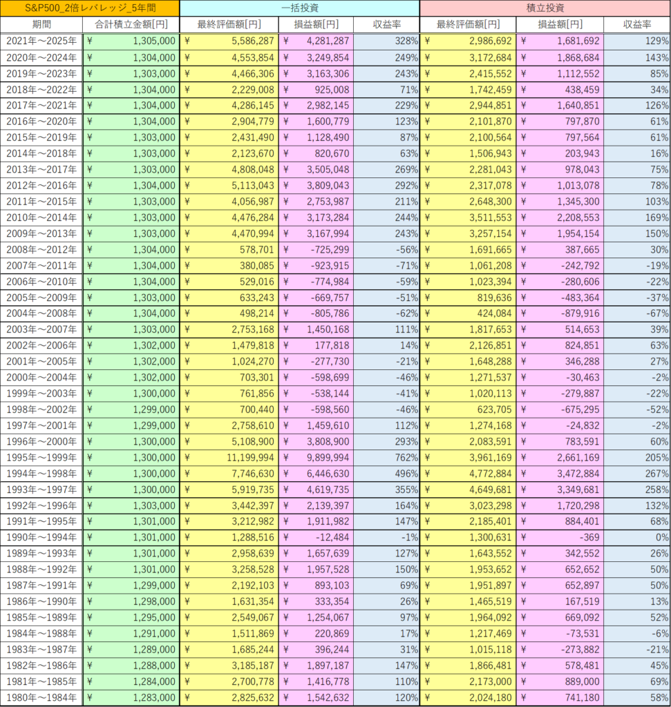 S&P500の2倍レバレッジを5年間投資した全期間データ