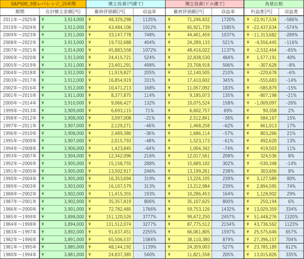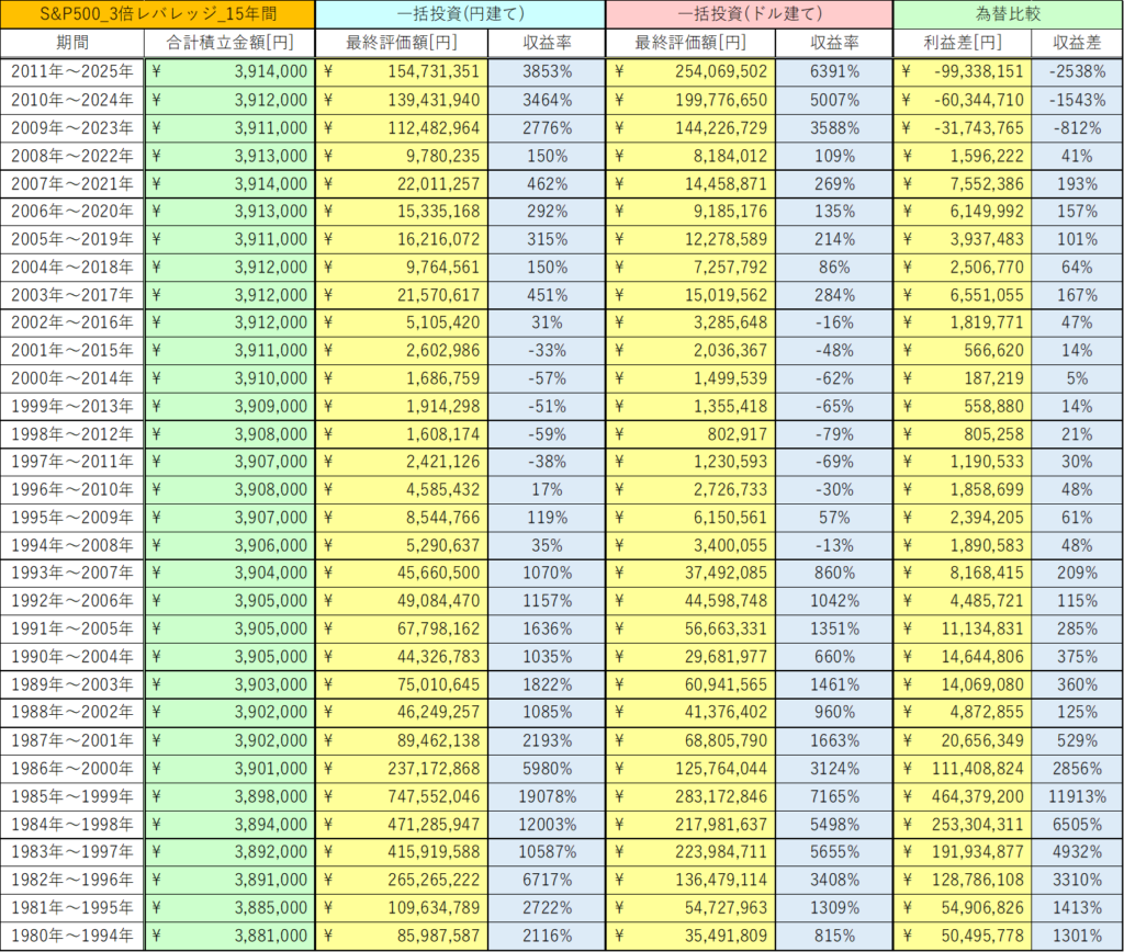 今回は、S&P500 3倍レバレッジの15年間の積立投資と一括投資における為替の影響を検証しました。