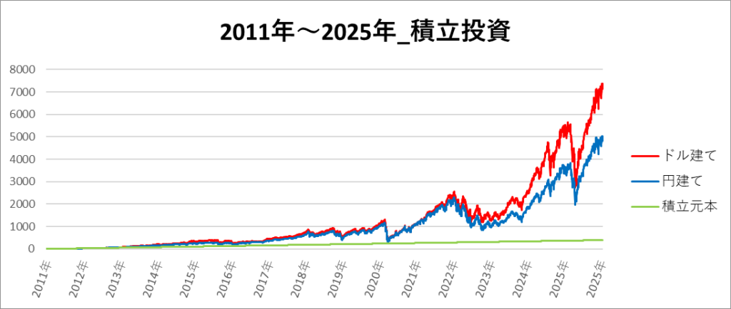 画像は「2011年~2025年」の期間におけるドル建てと円建てのS&P500の3倍レバレッジのチャートになります。