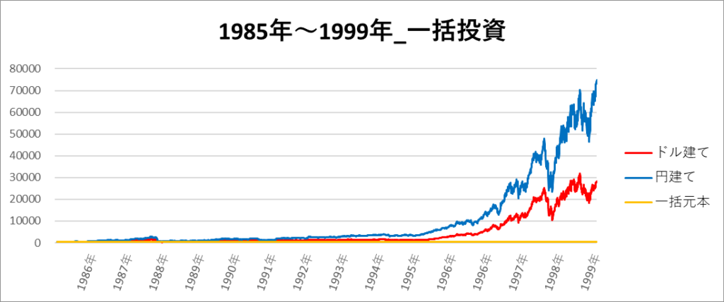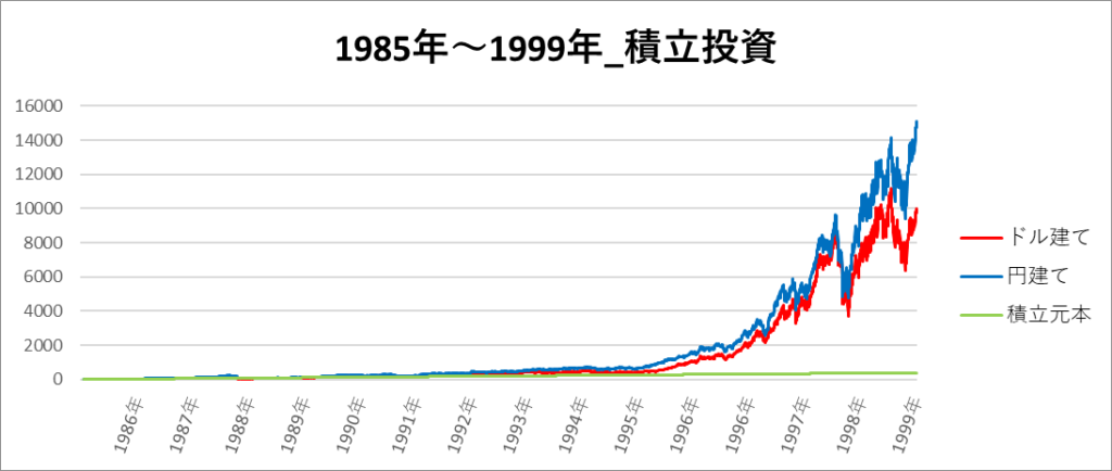 画像は「1985年~1999年」の期間におけるドル建てと円建てのS&P500の3倍レバレッジのチャートになります。