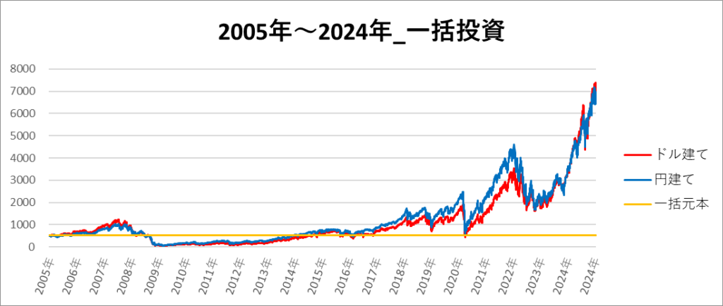 画像は「2005年~2024年」の期間におけるドル建てと円建てのS&P500の3倍レバレッジのチャートになります。