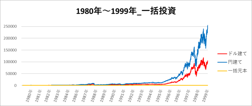 このチャートは、1993年ごろから円建てとドル建てのリターンの差が開き、最終的に円建ての方が約15億円も利益が多くなっています。