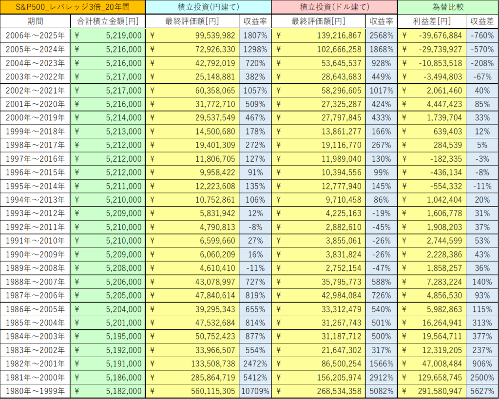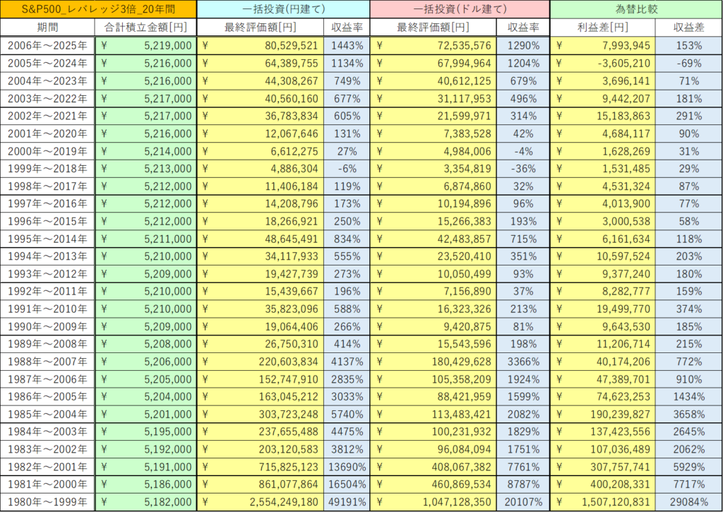 今回は、S&P500 3倍レバレッジの20年間の積立投資と一括投資における為替の影響を検証しました。